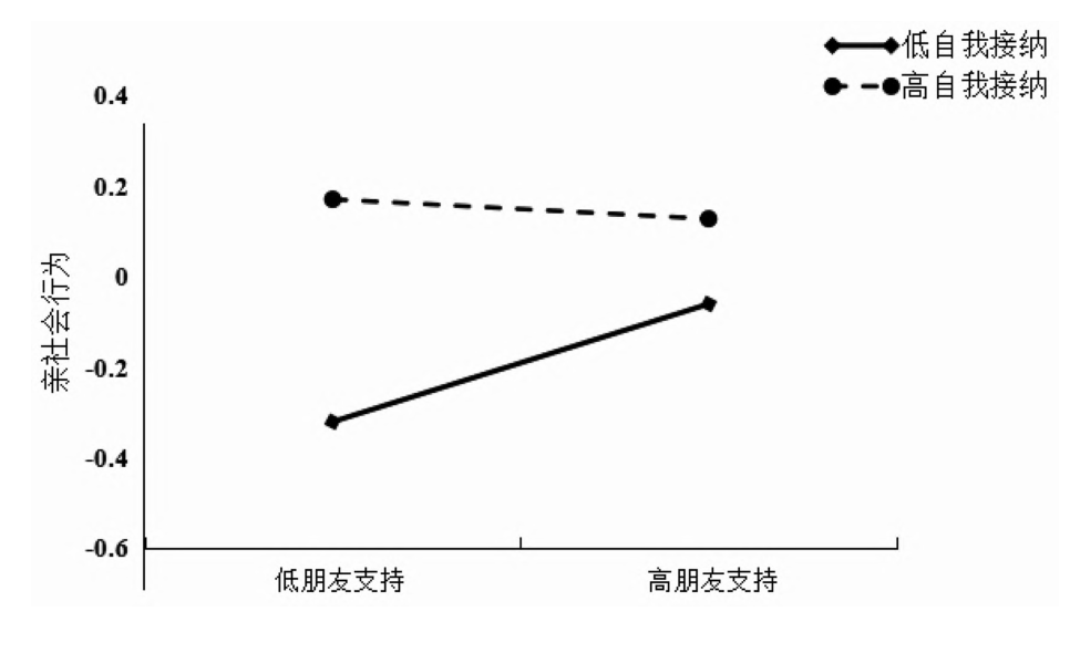 具体而言,自我接纳可以调节中介模型中友伴支持与亲社会行为之间的关系。